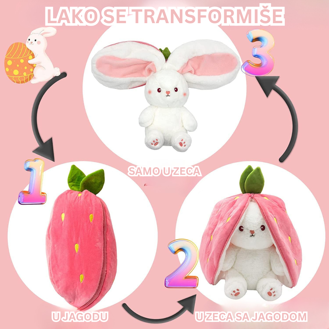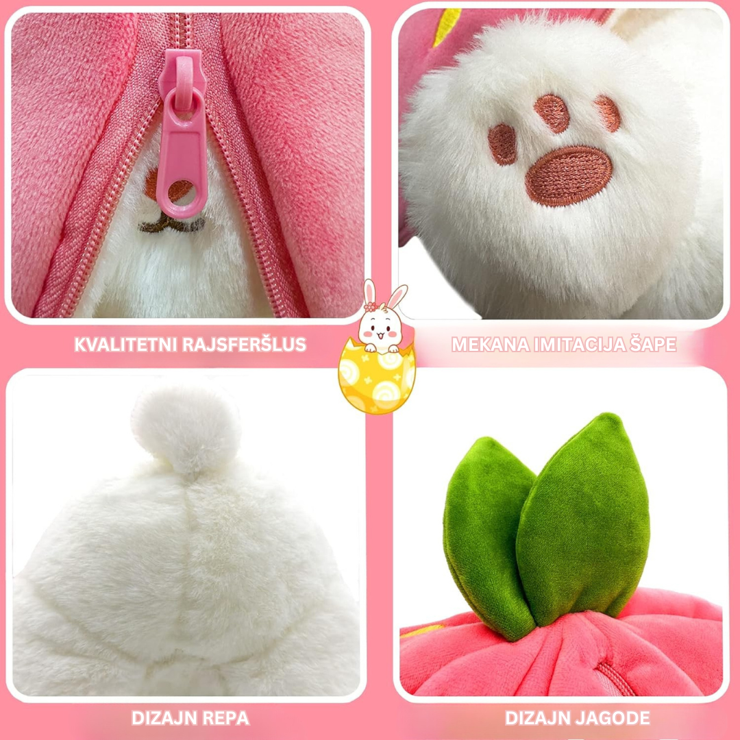 Ova plišana igračka donosi dvostruku zabavu – može biti preslatka jagoda ili šargarepa. Povlačenjem ili skidanje ušiju, dete dobija potpuno novu plišanu figuru, što je ekvivalent dve igračke u jednoj. Napravljena je od mekanih, kvalitetnih materijala, idealna za igru i maženje.