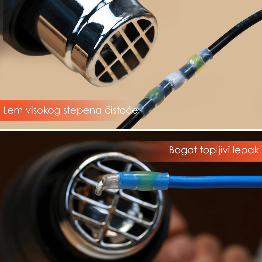 Pametna termo-lemljiva konekcija – brzo, čvrsto i vodootporno spajanje kablovaOvaj sistem za spajanje kablova olakšava električne popravke, čak i kada radite sami ili u uskim prostorima. Dovoljno je da ogolite kablove, postavite termo-lemljivi rukav, zagrejete – i veza je gotova za nekoliko sekundi. Lemljenje, zaptivanje i zaštita od vlage – sve u jednom potezu.