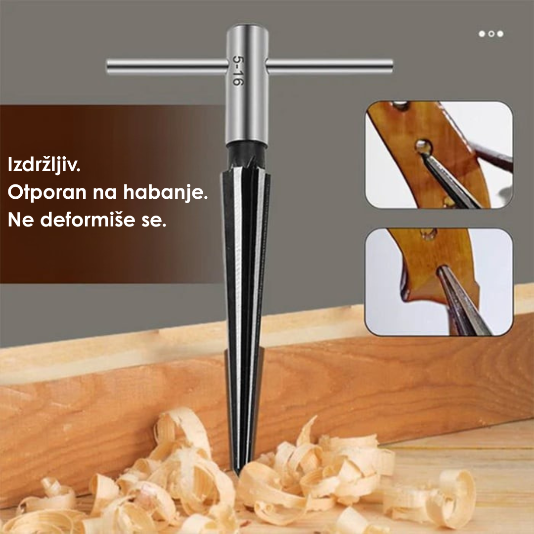 Konusni razvrtač sa T drškom je profesionalni alat za razvrtanje konusnih rupa, poravnavanje, fazovanje i uklanjanje neravnina u drvetu, olakšavajući i ugradnju šrafova. Dostupan u dve veličine, sa hexagonalnom ili okruglom drškom, omogućava precizne i glatke razvrte za različite projekte, uključujući velike rupe za gitare ili spojeve drvenih elemenata. Napravljen od visokokvalitetnog #45 visokougljeničnog čelika, izdržljiv je, stabilan i dovoljno snažan da probije sve materijale lako i precizno.