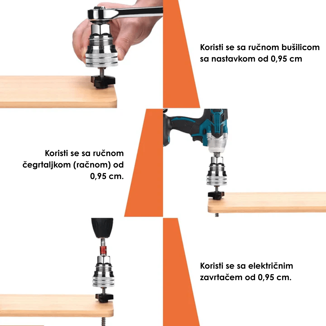 Možeš ga koristiti sa aku odvijačima, bušilicama, ručnim gedorama i drugim alatima, što mu daje veliku svestranost. Dolazi uz adapter koji omogućava brzo i sigurno povezivanje sa većinom standardnih uređaja. Zahvaljujući kompaktnom dizajnu, lako dopire i do teško dostupnih mesta gde obični ključevi ne mogu. Ovo omogućava brže, jednostavnije i urednije obavljanje svakog zadatka.